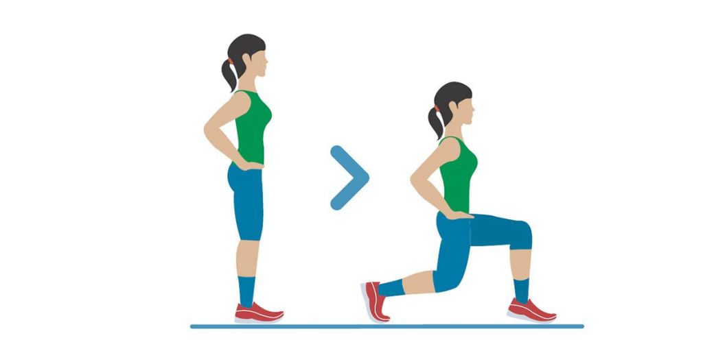 Manos en la cintura y un paso adelante hasta que la cadera quede a la altura de la rodilla, sin que ésta sobrepase la vertical del pie. Medio minuto con cada pierna.