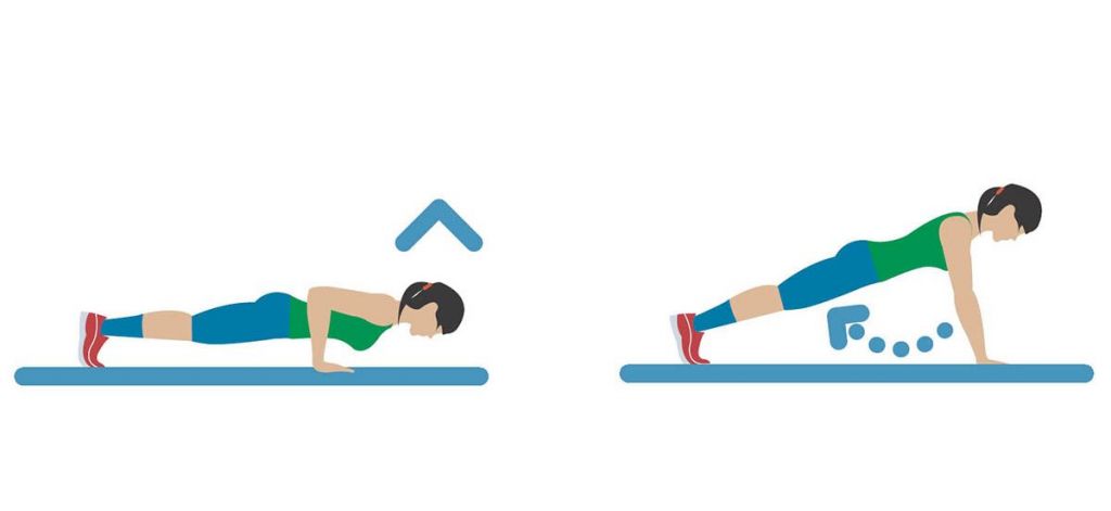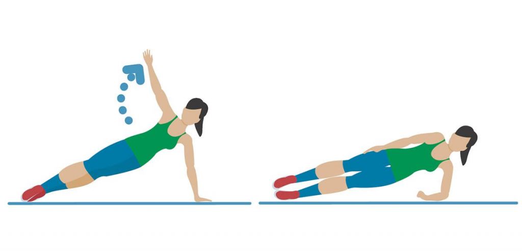 Enlaza un fondo de brazos con una torsión de tronco llevando un brazo arriba cada vez.