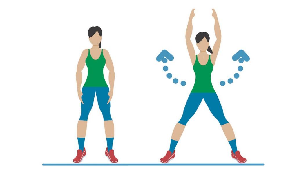 Saltos abriendo piernas y elevando brazos simultáneamente.