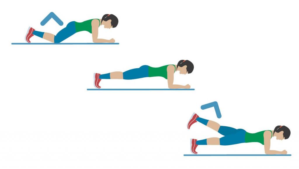 Manteniendo la posición de plancha con apoyo de antebrazos y elevación alterna de piernas.